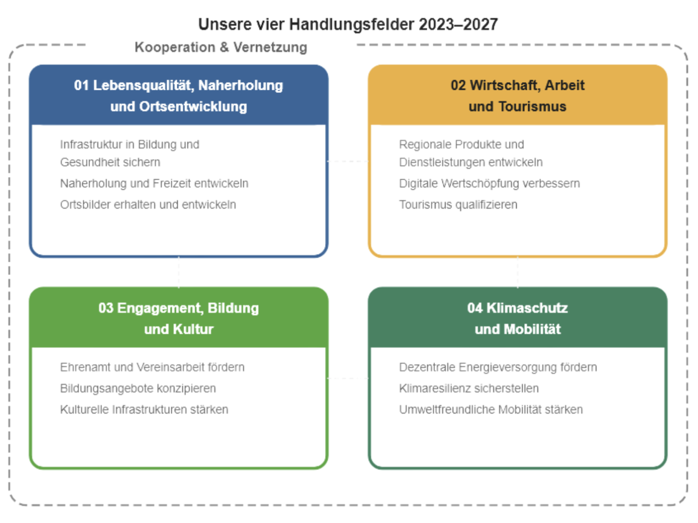 Unsere Strategie konzentriert sich auf vier Bereiche, die für die Zukunft der Region entscheidend sind: die Stärkung der Lebensqualität für alle Generationen, die Förderung der regionalen Wertschöpfung, die Unterstützung von bürgerschaftlichem Engagement und Ehrenamt sowie der Schutz von Umwelt und Klima.